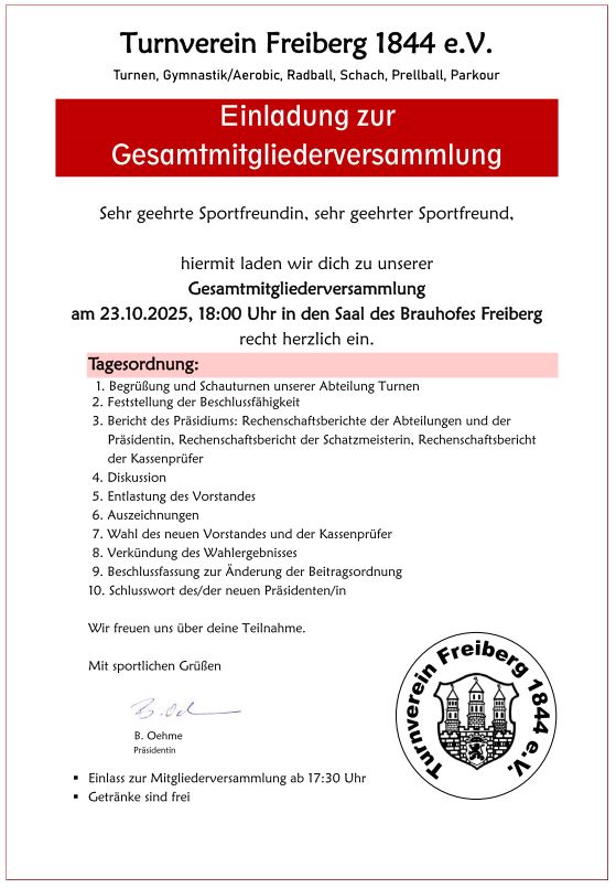 Die Mitgliederversammlung des TV 1844 Freiberg e.V., welche satzungsmäßig alle zwei Jahre einzuberufen ist, findet am
